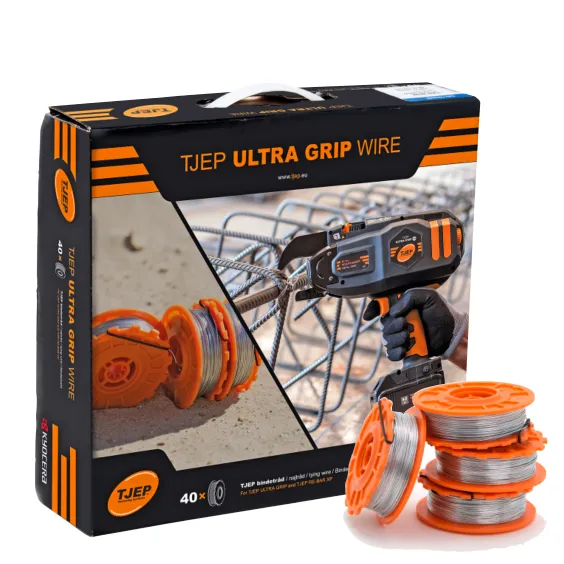 The new TJEP Ultra Grip wire has a higher tensile strength, improved flexibility and increased ductility. This balanced combination of features provides the ideal wire to produce a strong and efficient reinforcement steel connection. The wire is provided in a galvanised finish to improve corrosion resistance within the concrete. In addition the galvanised wire ensures the efficient operation of the Ultra Grip machine, eliminating rust deposits associated with mild steel wire, reducing the chance of corroded material accumulating in the internal workings of the tool affecting performance.