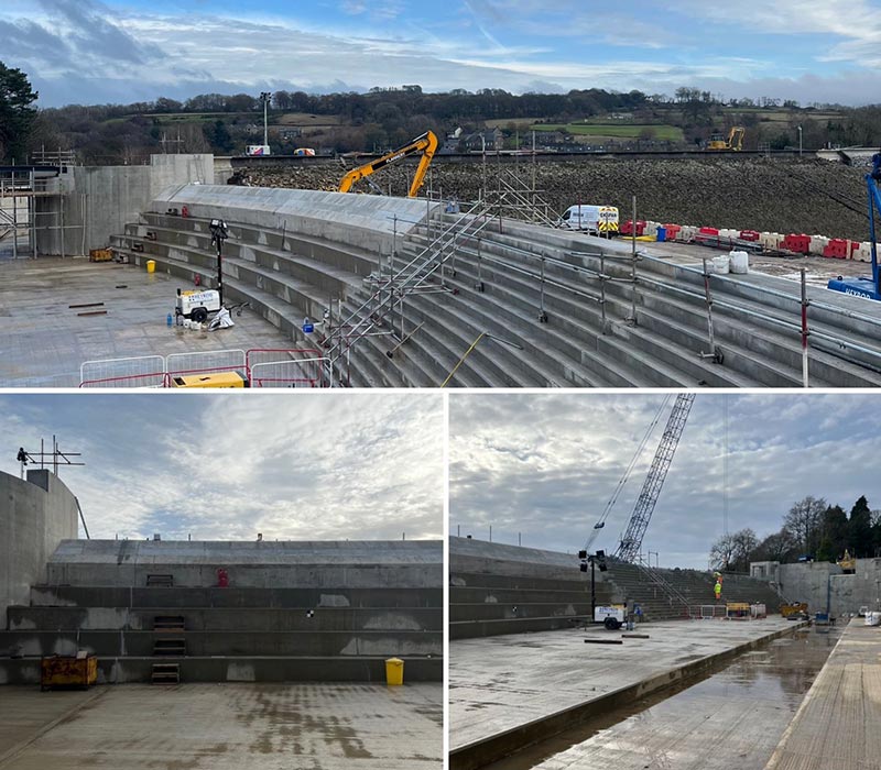 The multi‑year reconstruction of Toddbrook Reservoir has focused on delivering a completely new overflow spillway system after the 2019 auxiliary spillway failure, with major works led by the Canal & River Trust and contractor Kier. Construction has included excavating more than 15,000 tonnes of soil, installing over 500 concrete piles and 1,000 sheet piles to support the new spillway structure, alongside the creation of a new side weir, tumble bay, stepped spillway channel and stilling basin to safely route excess water into the River Goyt. By late 2025, the new spillway structure was completed, with landscaping, dam‑slope reinstatement and reservoir refilling scheduled through 2026 as the site is restored for community use. Capital Reinforcing supplied the steel reinforcement used during the construction works.